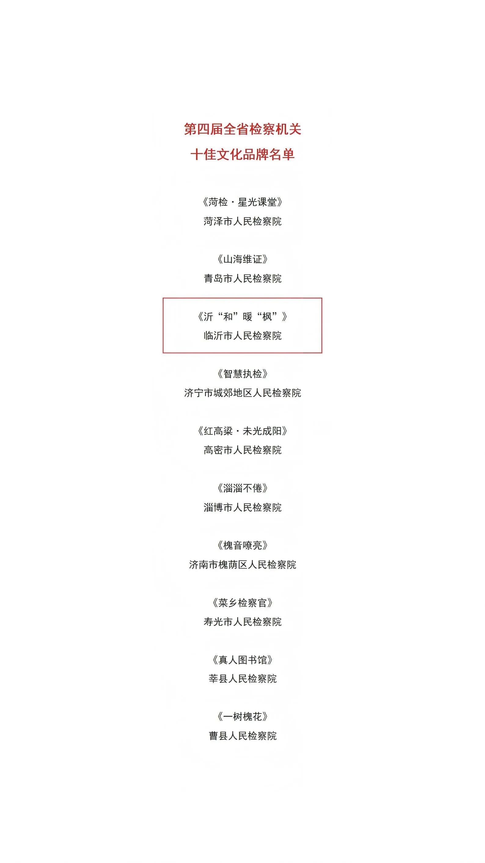 近日,第四届全省检察机关十佳文化品牌揭晓。经过初选、复选两轮角逐,临沂市检察院《沂“和”暖“枫”》检察文化品牌在33个品牌中脱颖而出,获评“全省检察机关十佳文化品牌”。