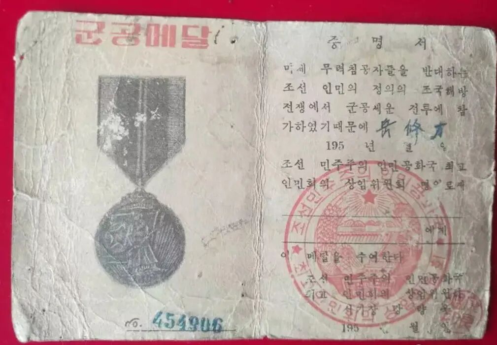 1953年朝鲜政府授予的“抗美援朝”勋章,其证书编号为NO454906,证书上盖有“康良煜印”的圆形印章,证书内容经翻译为:在反对米帝(美国帝国)武力侵略者的朝鲜人民的朝鲜解放战争中,因参与荣立军功的战斗,岳修才(手写)于195X年X月X日,以朝鲜人民民主主义共和国和最高人民会议常任委员会议名义,授予此章,朝鲜人民民主主义人民共和国,书记长(章)康良煜(时任朝鲜民主主义共和国副主席、朝鲜社会民主党委员长);