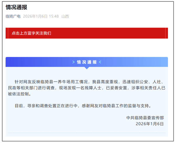 核心提示:中共临猗县委宣传部1月6日发布情况通报:针对网友反映临猗县一养牛场用工情况,山西临猗县高度重视,迅速组织公安、人社、民政等相关部门进行调查,现场发现一名残障人士,已妥善安置,涉事相关责任人已被依法控制。目前,寻亲和调查处置正在进行中,感谢网友对临猗县工作的监督与支持。1月6日,@上官正义 发布微博称...
